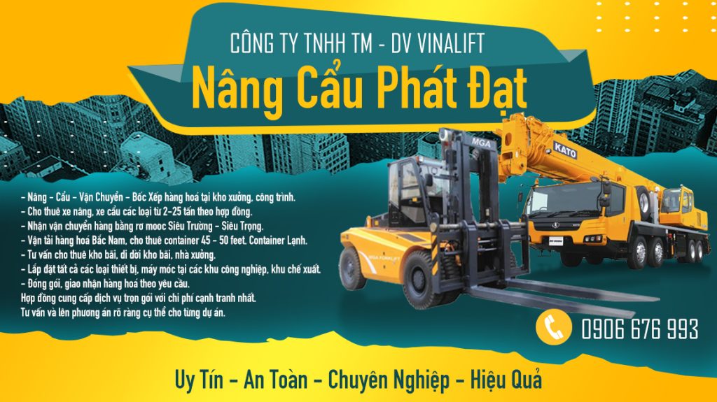Công Ty TNHH Thương Mại Dịch Vụ Vinalift – Nâng Cẩu Phát Đạt là một những đơn vị lâu đời tại Tp.Hồ Chí Minh chuyên cung cấp dịch vụ nâng cẩu bốc dỡ hàng hóa thiết bị bằng các phương tiện cơ giới như xe nâng xe cẩu. Ngoài ra còn tư vấn cung cấp dịch vụ thuê kho, vận chuyển giao nhận hàng hóa, cung cấp đội ngũ nhân công có tay nghề và kinh nghiệm trong lĩnh vực lắp đặt các thiết bị máy móc công nghiệp nặng vào vị trí tại các công trình, nhà xưởng .